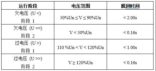 當電網電壓超過光伏逆變器的正常運行范圍時,逆變器應在規定時間內脫網,以保證設備的安全運行。逆變器應具備足夠的電壓測試精度,以便于及時偵測到電網電壓的異常,并在電網電壓異常的情況下執行保護動作。過/欠電壓保護采取二級保護策略,不同過/欠電壓下,光伏逆變器的脫網時間如下表所示: